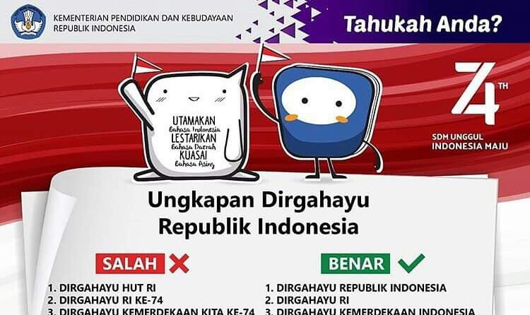 Untuk meluruskan cara penulisan untuk ungkapan tersebut, baru-baru ini Kementerian Pendidikan dan Kebudayaan (Kemendikbud) lewat laman resminya mempublikasikan cara penulisan “Dirgahayu” dan “HUT RI” dari Badan Pengembangan Bahasa dan Perbukuan lewat poster dibawah ini.