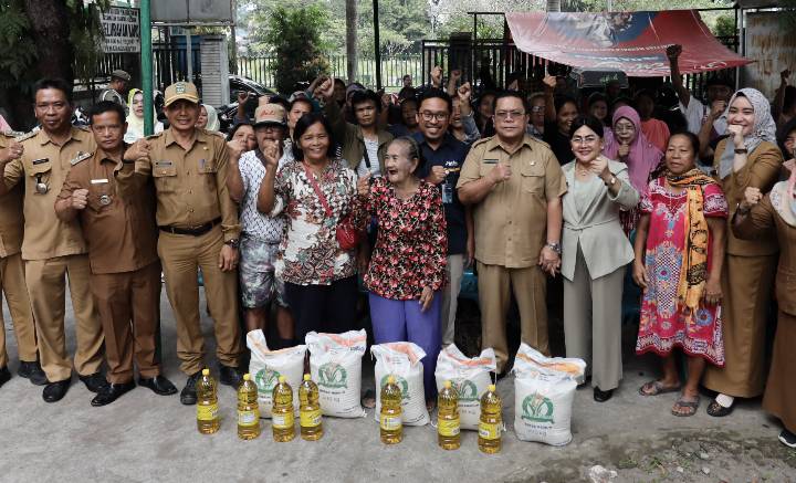 Siantar — Pemko Pematangsiantar menyerahkan bantuan pangan kepada masyarakat Penerima Bantuan Pangan (PBP) di Kantor Kelurahan Karo, Kecamatan Siantar Selatan, Selasa (25/11/2025).