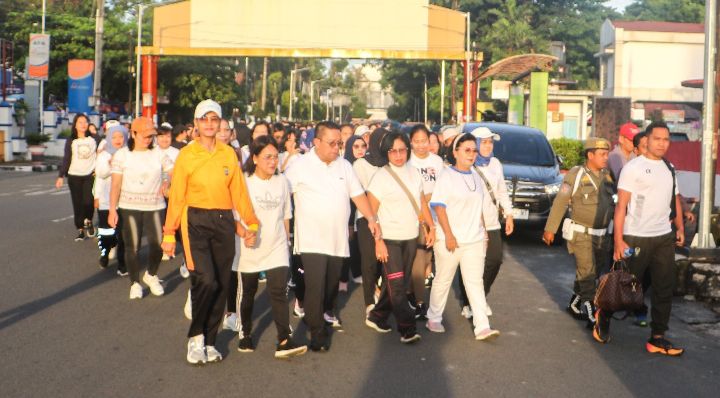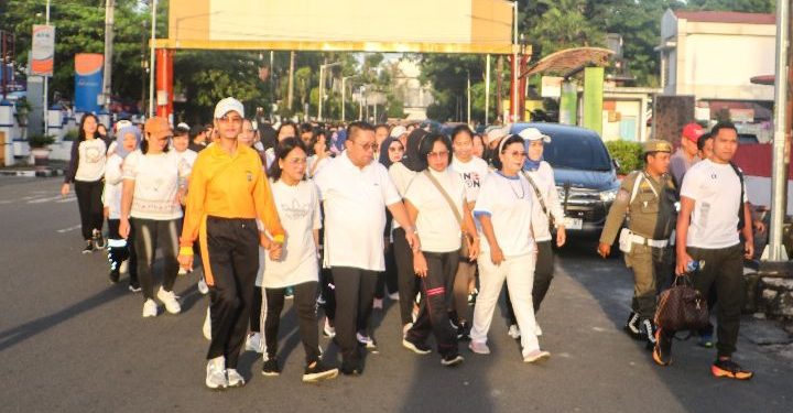 Siantar — Walikota Pematangsiantar, Wesly Silalahi, bersama Ketua TP PKK, Ny Liswati Wesly Silalahi, mengikuti kegiatan Fun Walk bertema Sehat Bersama Bidan Indonesia, pada Minggu pagi (08/6/2025), di Lapangan Parkir Pariwisata.