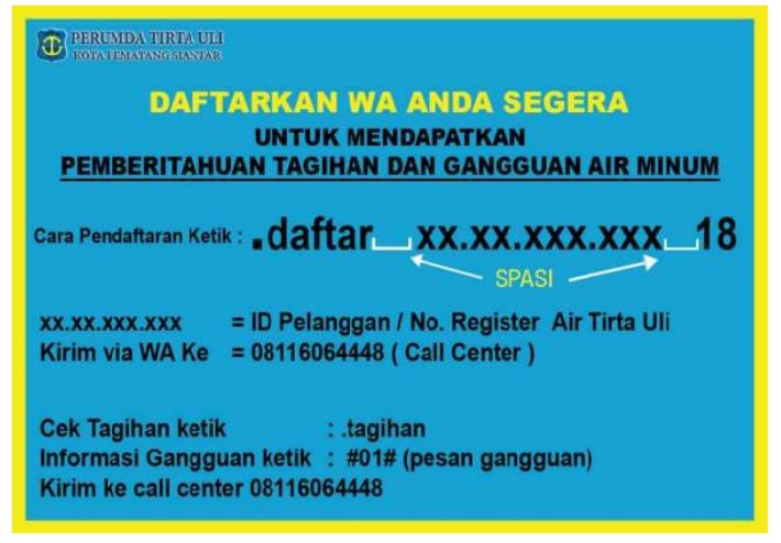 Oleh karena itu Perumda Tirtauli akan segera meluncurkan layanan terbaru ini. Caranya sangat mudah, yakni hanya dengan mendaftarkan nomor WhatsApp (WA) Anda!