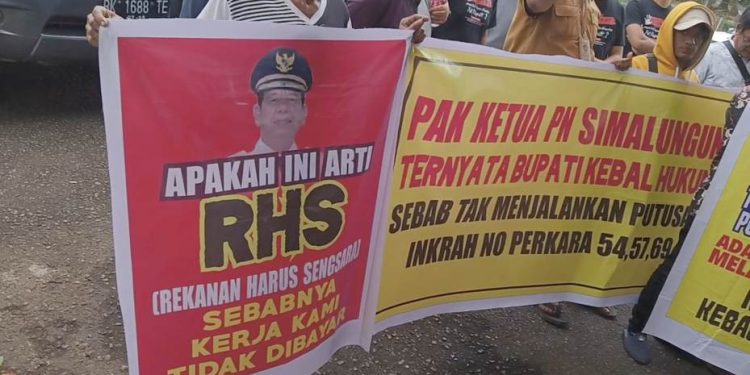 Simalungun — Belasan kontraktor rekanan Pemkab Simalungun yang menamakan diri Forum Korban Gagal Bayar Bupati Simalungun menggelar aksi unjuk rasa di halaman Kantor Bupati Simalungun, Pamatang Raya, pada Selasa siang (21/13/2023), untuk menuntut Pemkab Simalungun membayar proyek yang sudah mereka kerjakan di tahun 2021 lalu.